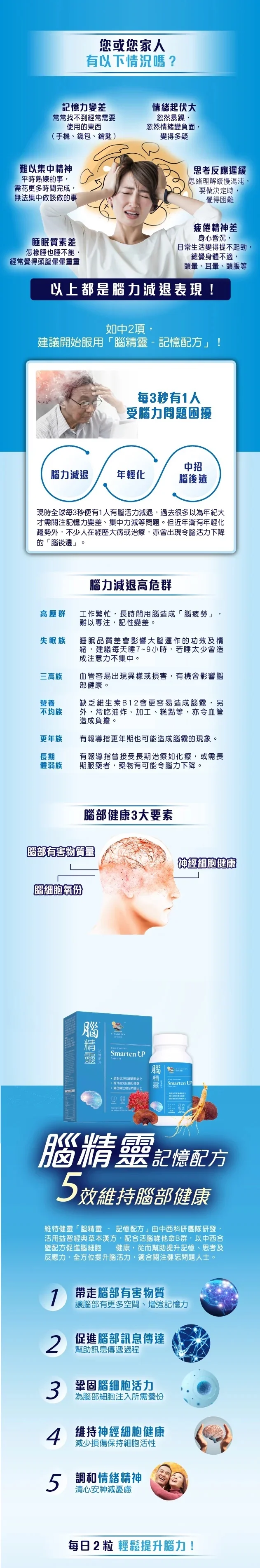 • 以上都是腦力減退表現!如中2項,建議開始服用「腦精靈 – 記憶配方」!