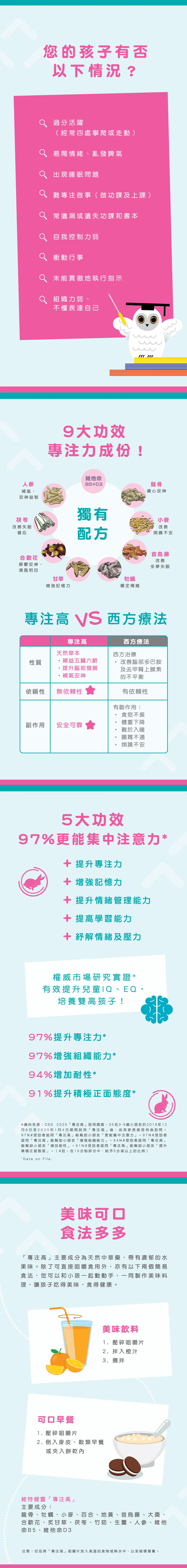 • *資料來源:CSG2020「專注高」試用調查,35名3-9歲小朋友於2019年12月8日至2020年1月4日期間試用「專注高」後,由其家長接受用後訪問。97%受訪者認同「專注高」能幫助小朋友「更能集中注意力」。